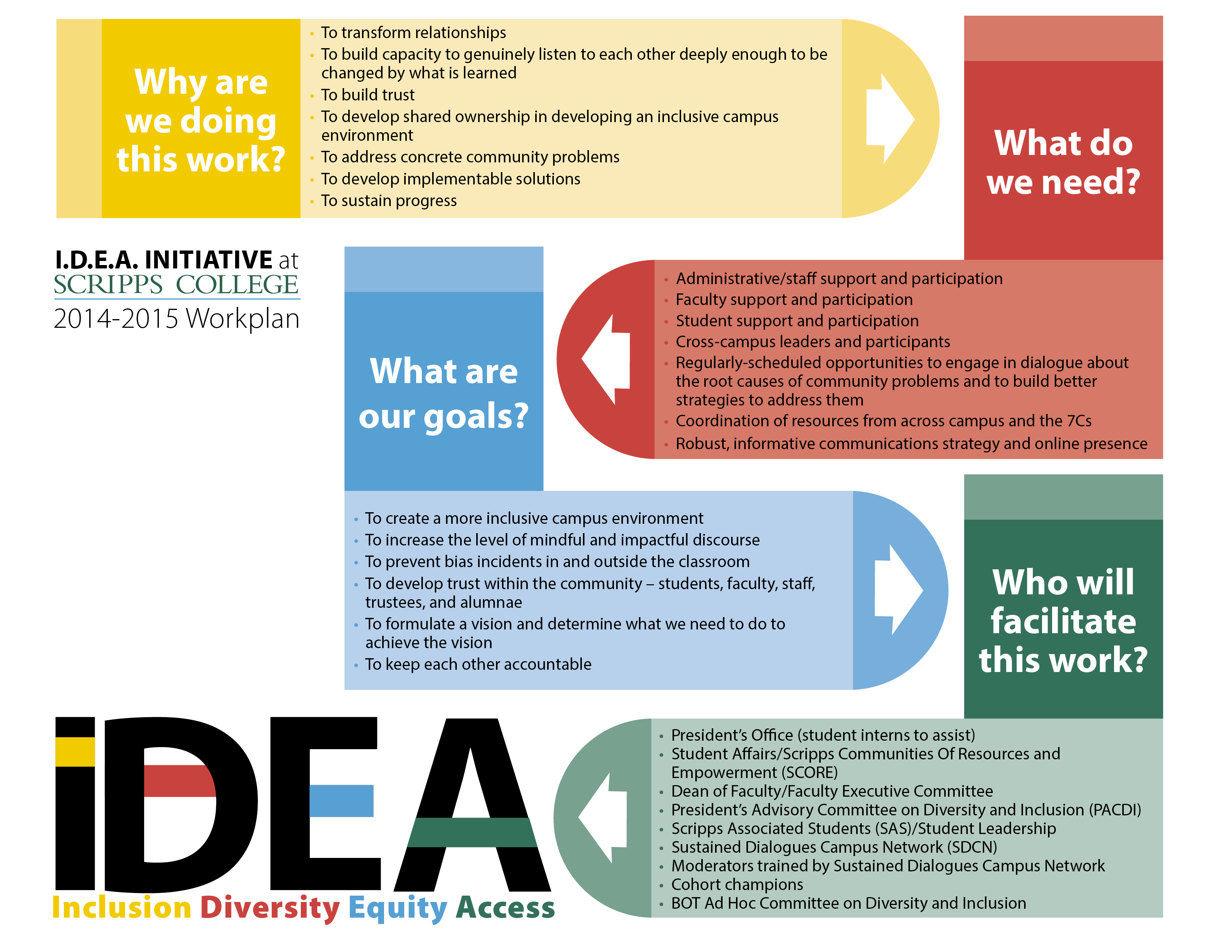 In 2013, the College approved the Diversity Strategic Plan, which established our goals for diversity and inclusion and defined strategies to realized the priorities defined over the past decade. The plan represented a higher level of commitment to economic, ethnic, religious, political, and cultural diversity within its academic, residential, and co-curricular communities in the following areas. You can review the original IDEA strategic plan and workflow here.