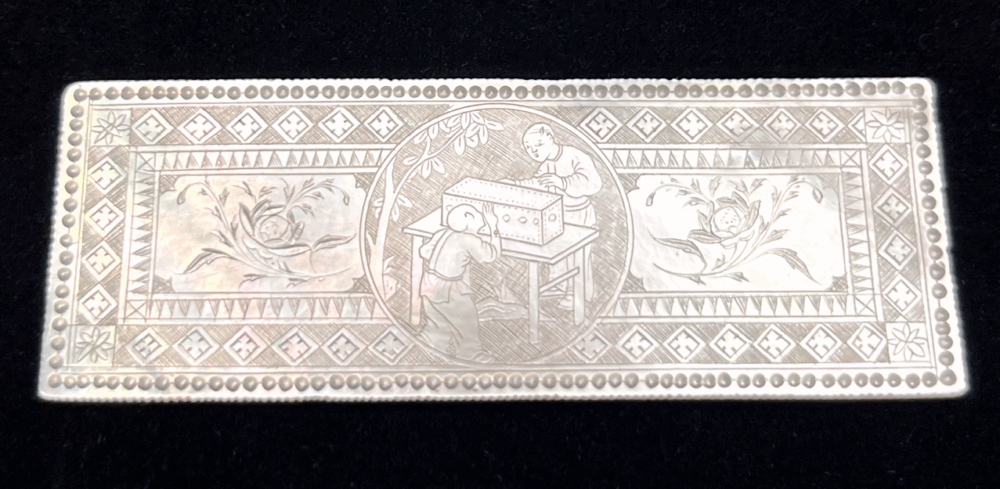 Series 4. A mother-of-pearl thread winder with a carved design.