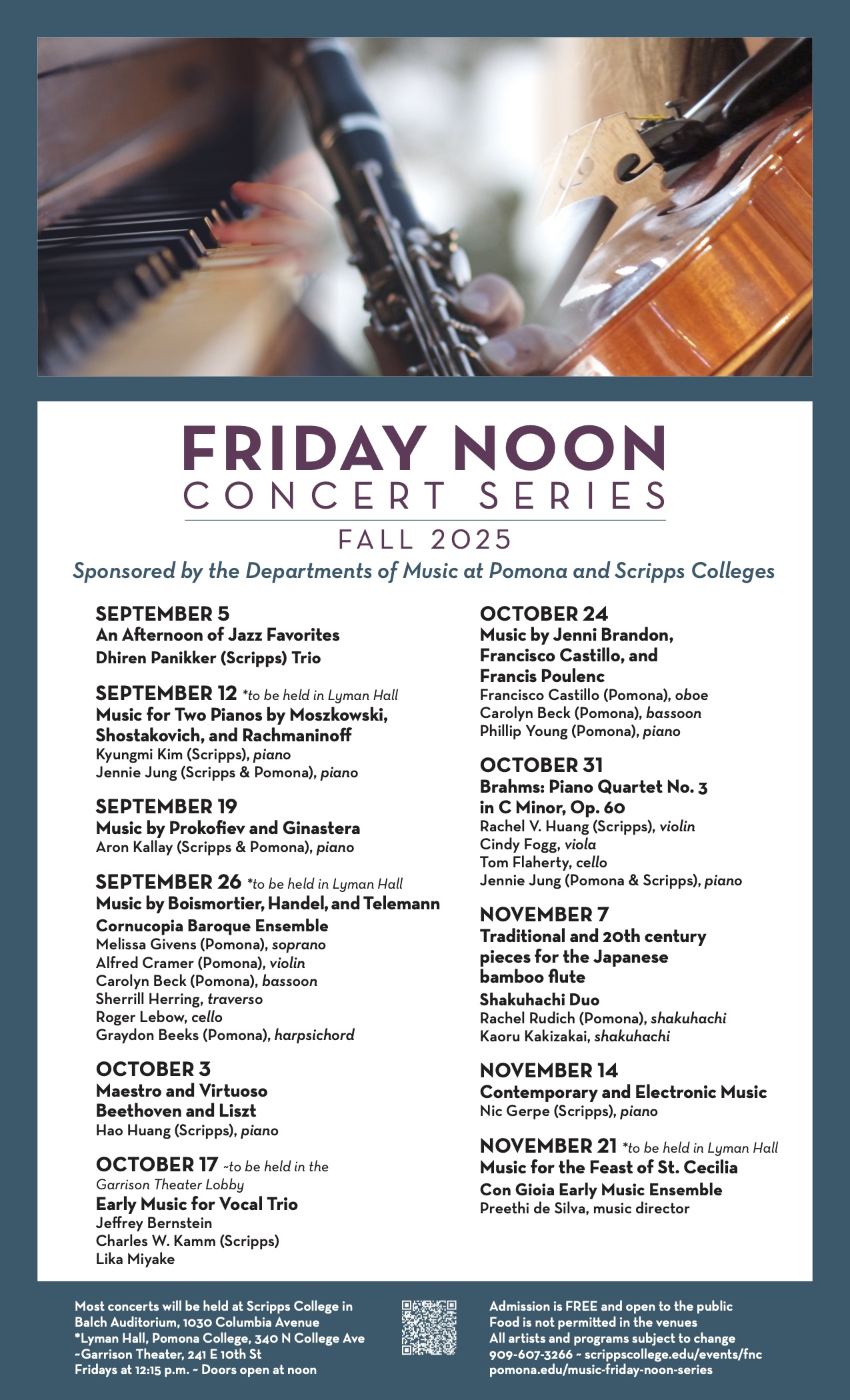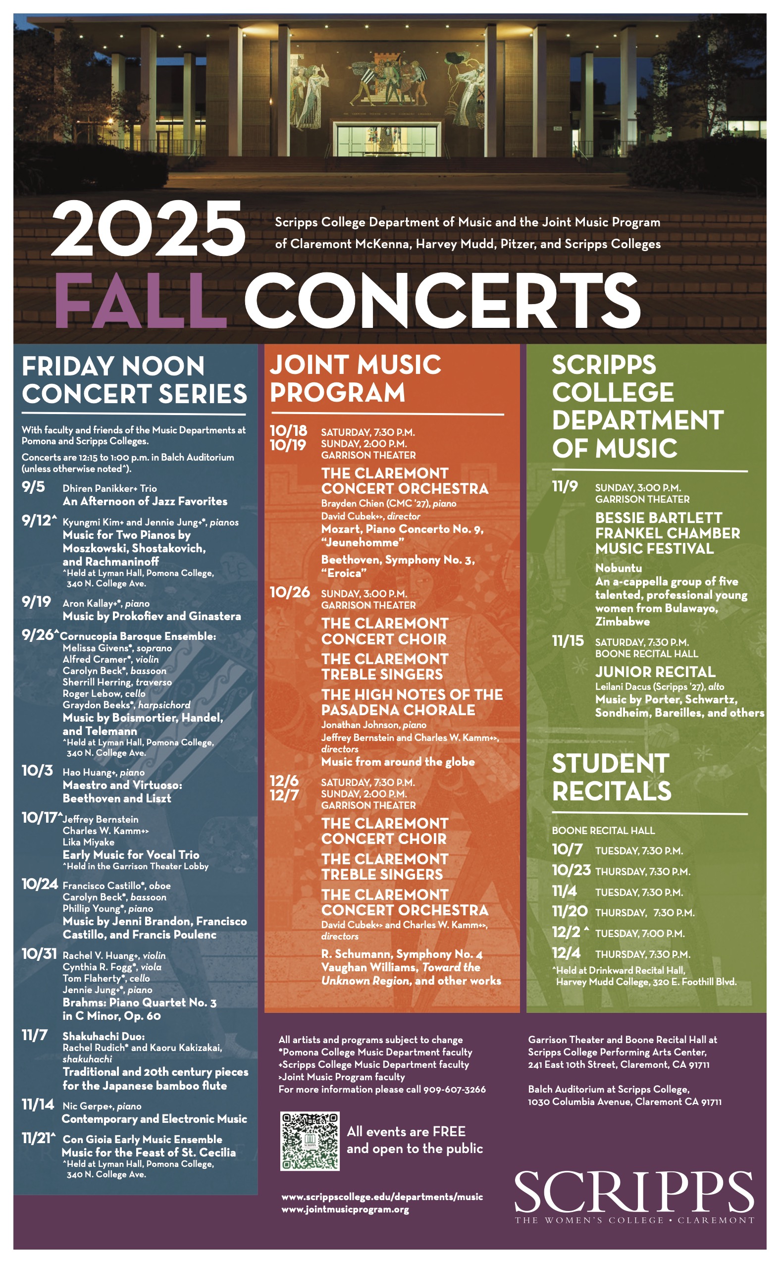 All performances to be held at the Scripps College Performing Arts Center (PAC) 241 East 10th St. or in Balch Auditorium, 1030 Columbia Ave. unless otherwise stated.