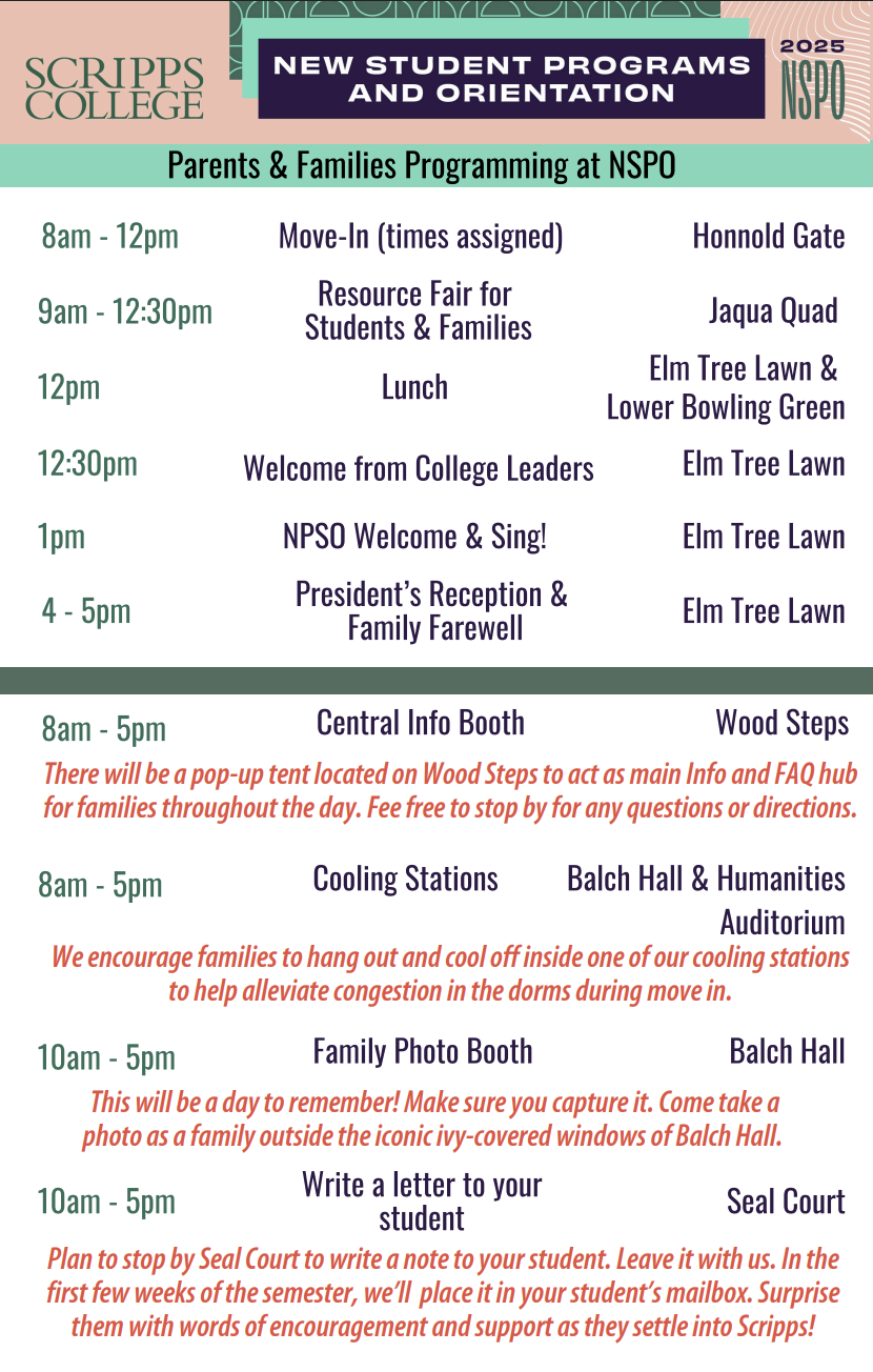 We know that this is a time of great anticipation for our incoming parents and their students! Soon enough, your student will be moving into Scripps to officially start their first year. Here is some basic information to help with your planning and in supporting your student as they prepare for their arrival on campus: