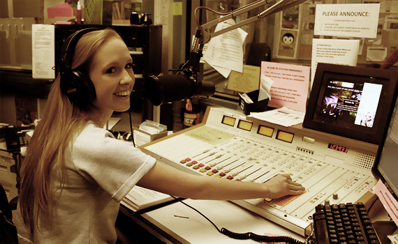 Student DJs are required to select playlist songs from the station’s in-house library, and of those, 50 percent must be new releases. About 60 student volunteers serve as rotating DJs, newscasters and talk show hosts or segment producers. Many, like Allison, seek out the station because they love music.
