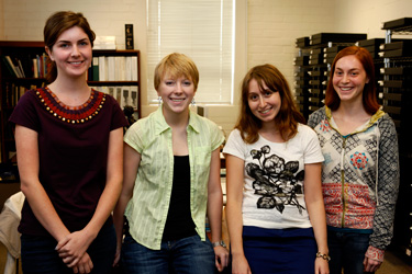 For 17 years, Wilson interns have made vital contributions to the Ruth Chandler Williamson Gallery program. These students learn how to care for the Scripps permanent collection, organize an exhibition, and prepare catalogs. These special opportunities are the gift of C. Jane Hurley Wilson ’64 and Michael G. Wilson, who annually support a full-time summer internship, as well as three part-time academic-year internships. This year’s interns, McKenzie Floyd ’12, Danielle Kaufman ’10, Ashley Newton ’10, and Jennie Waldow ’12, are writing essays about rare photographs donated by the Wilsons, which will be featured in a catalog accompanying a fall 2011 exhibition, “Focus on Photographs.”