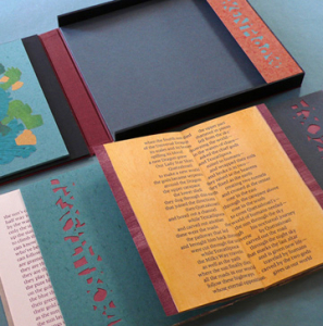 Tisdale, who teaches print and book classes at the University of Maine, has worked in Bangor, Maine, since 1987 printing and publishing handmade books. His own books are collaborations with poets and artists using letterpress types and relief prints. He uses handmade papers, many by a local papermaker, to heighten the sensual awareness of the book in one’s hands. Tisdale says that the books design themselves depending on the particular manuscript.