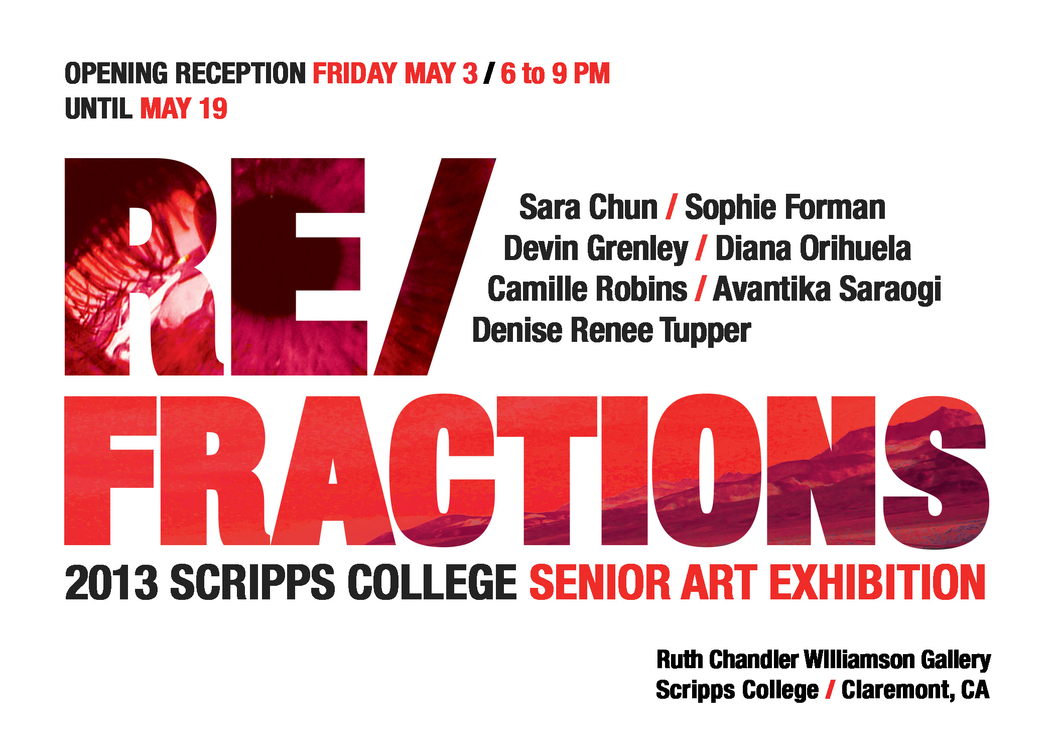 “Re/Fractions,” the annual senior art show highlighting the final thesis projects of graduating studio art majors, will be on display from May 3 to May 19 at Scripps College’s Ruth Chandler Williamson Gallery. An opening reception is scheduled at 6 p.m. on May 3 in Bixby Courtyard. The exhibition and reception are free and open to the public.