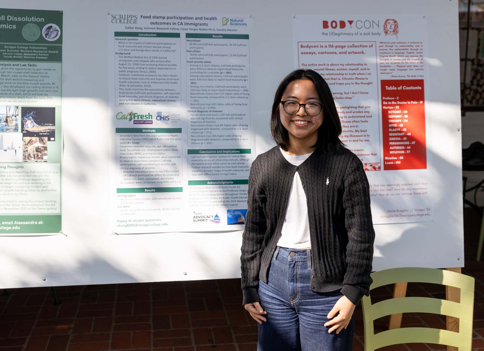 Research from fellow Johnson Grant recipient Esther Kang ’26 also focused on how to increase human thriving. Prompted by her own immigrant upbringing, Kang peeled back the layers between food insecurity and adverse health outcomes for US-born citizens, naturalized citizens, and immigrants.