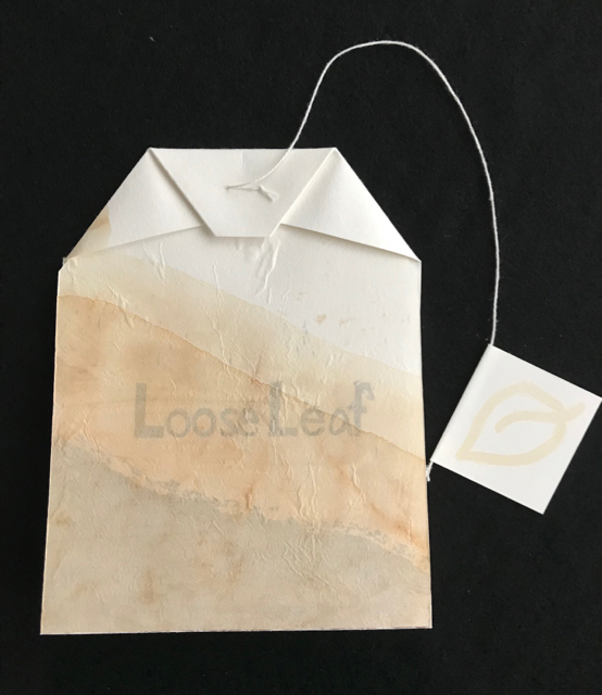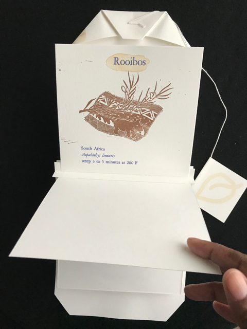 Loose Leaf by Morgan Carothers is a flag book showcasing teas from across the globe. It features ten teas, both herbal and caffeinated, and each is accompanied by a linoleum block print and brewing instructions, and the country or region where it traditionally sipped. Letterpress printed on Rives BFK paper with tea stained rice paper pages, the edition size is fifteen copies. 7 by 8.5 inches.